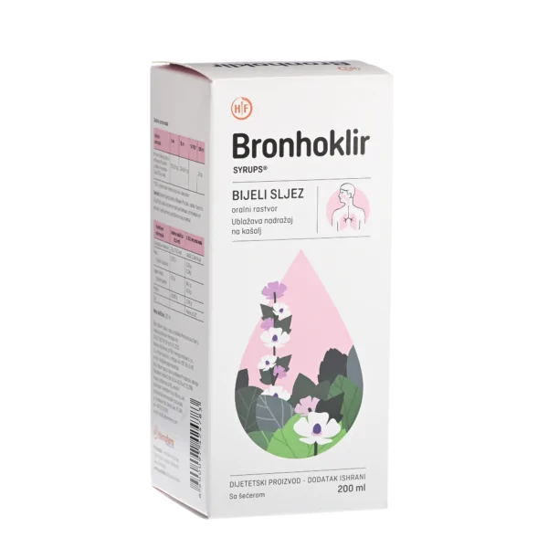BRONHOKLIR® sirup bijeli sljez sadrži ekstrakti bijelog sljeza i kamilice koji ublažavaju suv i iscrpljujući kašalj * Primjenjuje se kada ne postoji sluz u disajnim putevima, već samo uporni nadražaj na kašalj.
