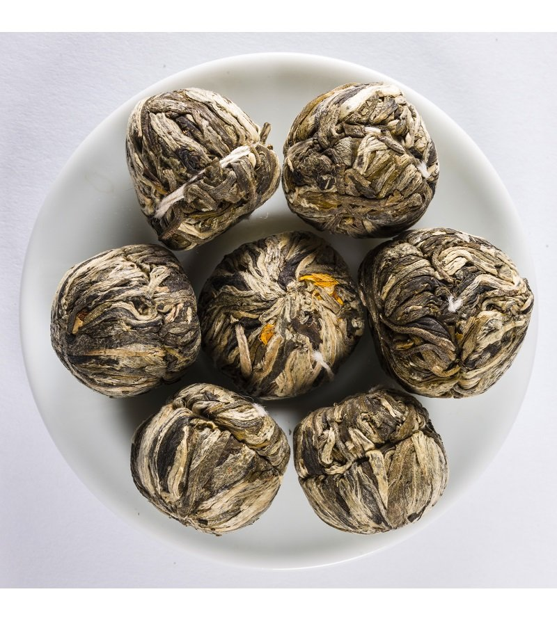 Materijal za čaj pažljivo se proizvodi i skladišti u proljeće. Neven dolazi iz Neimenggua (Mongolija), cvjetovi jasmina iz Hengxiana u Guangxiju. U Fujian Fuanu cvjetovi i zeleni čaj se ručno obrađuju pojedinačno i zatim se vješto suše kao čajne kuglice. Iskustvo: Ovaj ekskluzivni cvijetni čaj u obliku kuglice je prava umjetnost koja očarava svojim izgledom. Njegovu tajnu otkrivate kada ga stavite u stakleni čajnik i prelijete vodom. Upravo tada počinje ceremonija infuzije što i čini ovaj čaj veličanstvenim.
