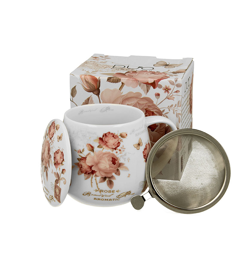 Šolja za čaj od 430 ml sa inoks infuzerom, izrađena od porculana New Bone China, koju karakterizira elegantna i prirodna krem-bijela boja s nježnim sjajem, kao i iznimna trajnost. Linija je ukrašena motivom cvijeća ruže i poštanskim markama. Tople i prigušene boje liniji daju klasiku i eleganciju. Savršeno za pripremu vaših omiljenih čajeva. Sve upakirano u ukrasnu kutiju ukrašenu istim motivom