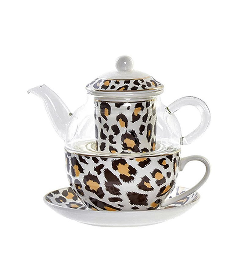 Stakleni čajnik sa porculanskom šoljicom, tanjirićem i porculanskim filterom. Čajnik je izrađen od kaljenog stakla, dok su šolja, filter i tanjirić od porcelana koji se odlikuje prirodnom kremasto bijelom bojom nježnog sjaja i izuzetne čvrstoće i izdržljivosti. Linija je ukrašena motivom leopard printa. Sve upakovano u ukrasnu kutiju ukrašenu istim motivom odlična je ideja za originalan poklon.
