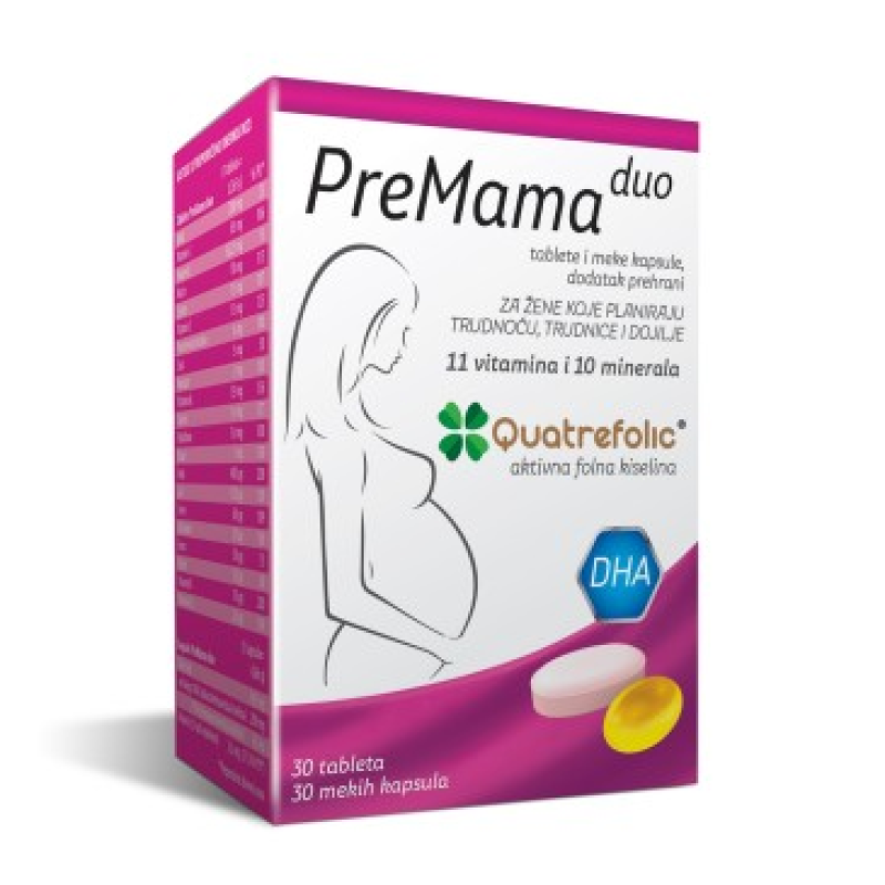 Tablete i kapsule Premama Duo su specijalno formulirane da osiguraju potrebnu količinu folata (400 µg) i vitamina D, zajedno sa ostalim vitaminima, mineralima i omega 3 masnim kiselinama u svim fazama trudnoće, u cilјu zadovolјenja povećanih potreba organizma.