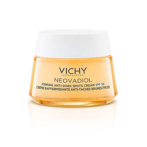 Vichy Neovadiol Post-Menopause krema protiv tamnih mrlja SPF50.Smanjuje bore , štiti od pojave tamnih mrlja.Povećava elastičnost.Pomaže ublažiti štetne uticaje menopauze i UV zračenje.Koža djeluje čvršće,a bore i tamne mrlje svakim danom sve su manje vidljive.Tijekom razdoblja postmenopauze hormonalne promjene ubrzavaju starenje kože. Smanjuje se proizvodnja lipida, što uzrokuje povećanu akutnu suhoću kože. Bore postaju izraženije, a koža gubi na čvrstoći.